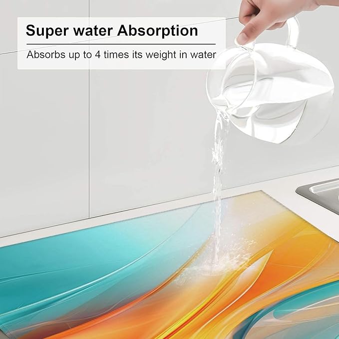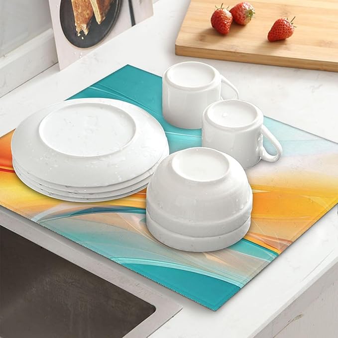 - Premium Microfiber Polyester Material: This modern teal and orange geometric wave dish drying mat is crafted from high-quality microfiber polyester, making it an absorbent dish drying mat that effectively soaks up water, keeping your kitchen counter dry. As a microfiber dish drying mat, it ensures durability and long-term use, ideal as a dish drying pad for kitchen counter